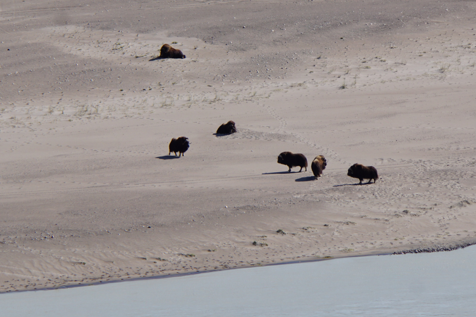 W końcu znalazły się i piżmowoły. Spędziliśmy tydzień na szlaku nie spotykając ani jednego, by odnaleźć je w Kangerlussuag nad rzeką. A nie mówiłem, że lubią plażować?