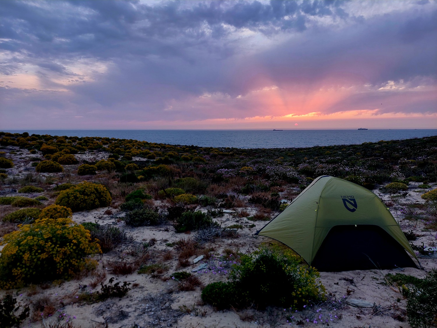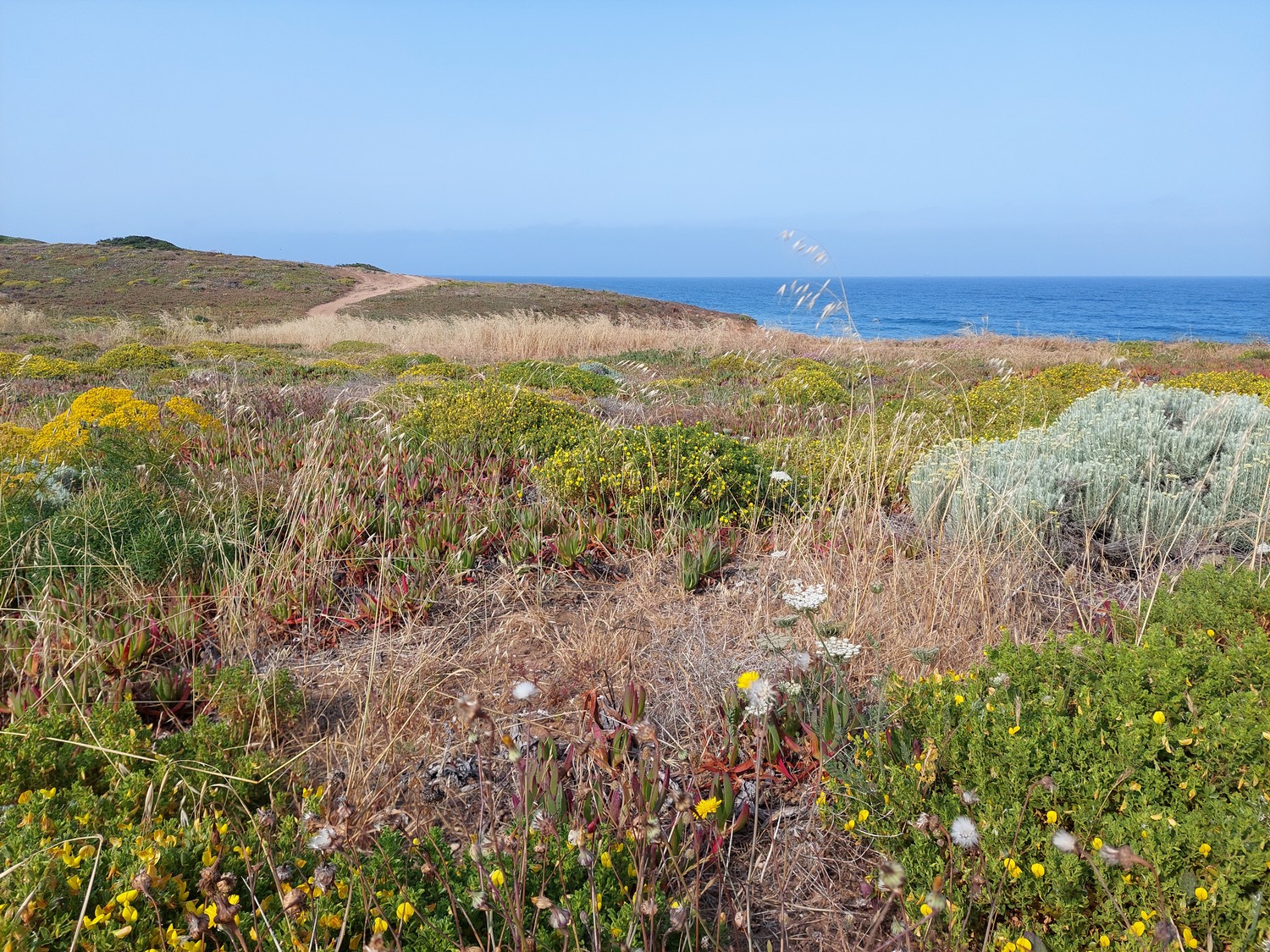 Po odebraniu plecaka ruszyliśmy z Karolem do Porto Covo – stamtąd miała zacząć się właściwa wędrówka. Było późno, więc zaczęliśmy szukać noclegu z namiotem… i trafiliśmy idealnie: ukryte miejsce na klifie, z widokiem na zachód słońca nad oceanem. To był najpiękniejszy nocleg całej wyprawy. Cisza, przestrzeń, horyzont.