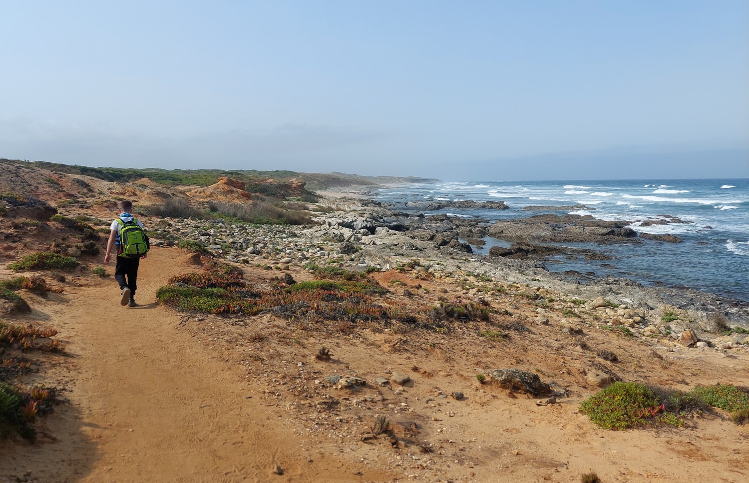 Dzisiejszej nocy był trzeci nocleg na dziko, choć brudni i spoceni wyglądalismy jak dwa nieszczęścia. Zjedliśmy na śniadanie chleb z miodem i dotarliśmy do Zambujeira do Mar. Po trzech nocach w namiocie postanowiliśmy odpocząć i zanocować w pensjonacie z prysznicem i łóżkiem (luksus!). Wieczorem wybraliśmy się jeszcze na spacer na plażę pod klifem, ale zejście okazało się zbyt strome i błotniste – nawet z pomocą trzech naturystów na dole 😉