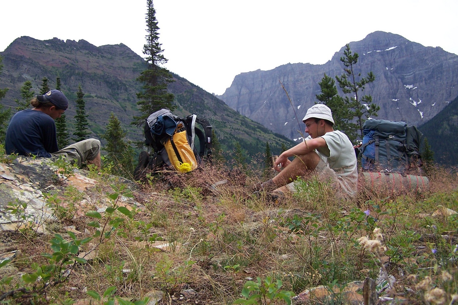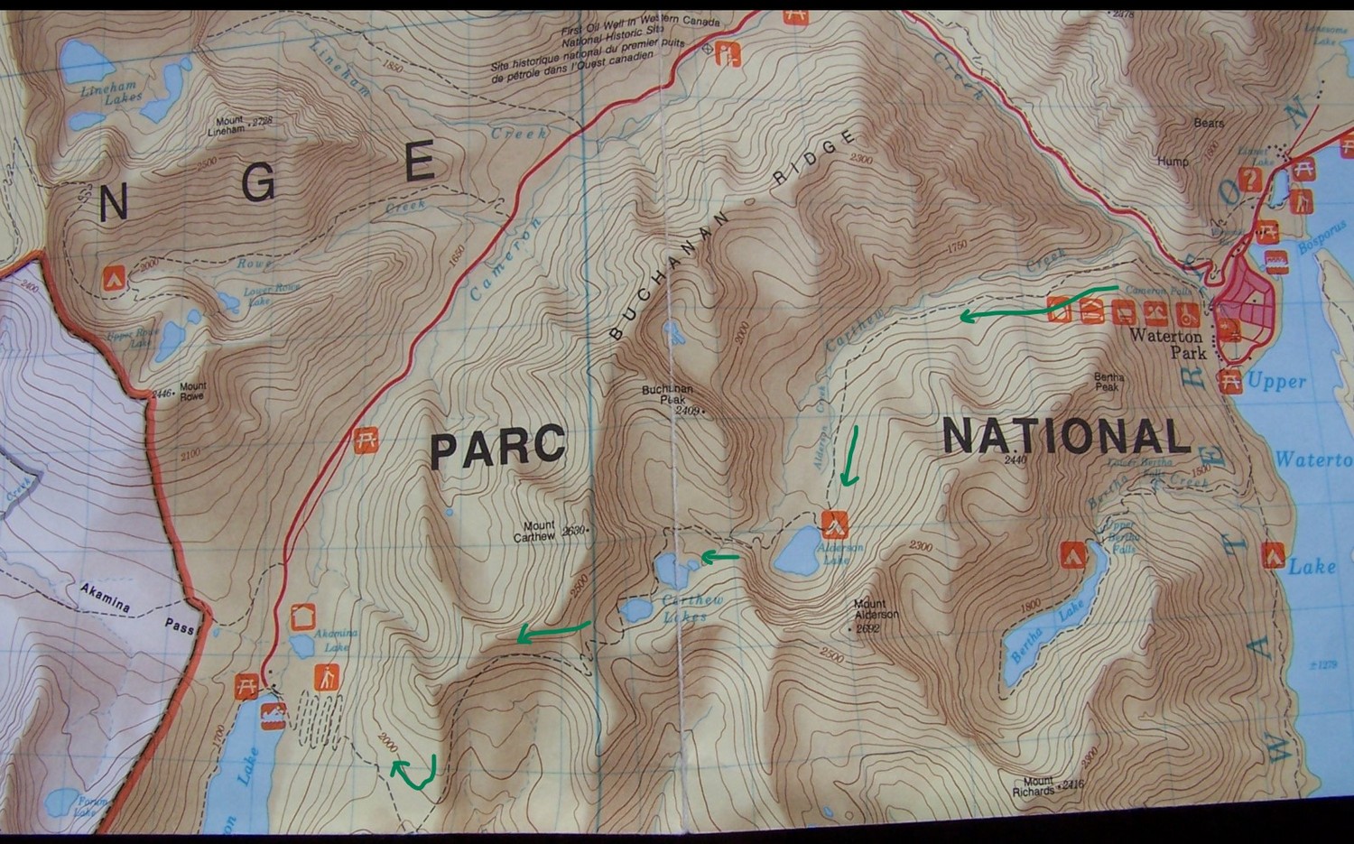 Z miejsca, gdzie szlak osiąga najwyższą wysokość, rozciąga się niesamowita panorama na amerykańską część Parku oraz na leżące w dole jeziora. Ponieważ do jeziora Cameron Lake jest tu stąd tylko kilka kilometrów, zaczynają się pojawiać ludzie, którzy dalej już nie dochodzą. Kopiuję więc od jednego z nich pożądną mapę topograficzną i tak wyposażony schodzę w dół.
