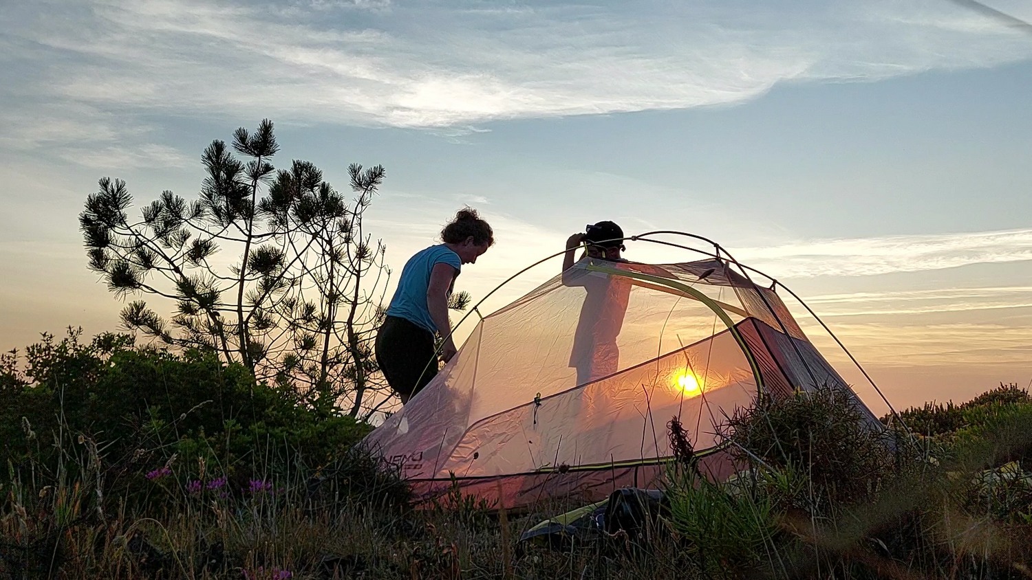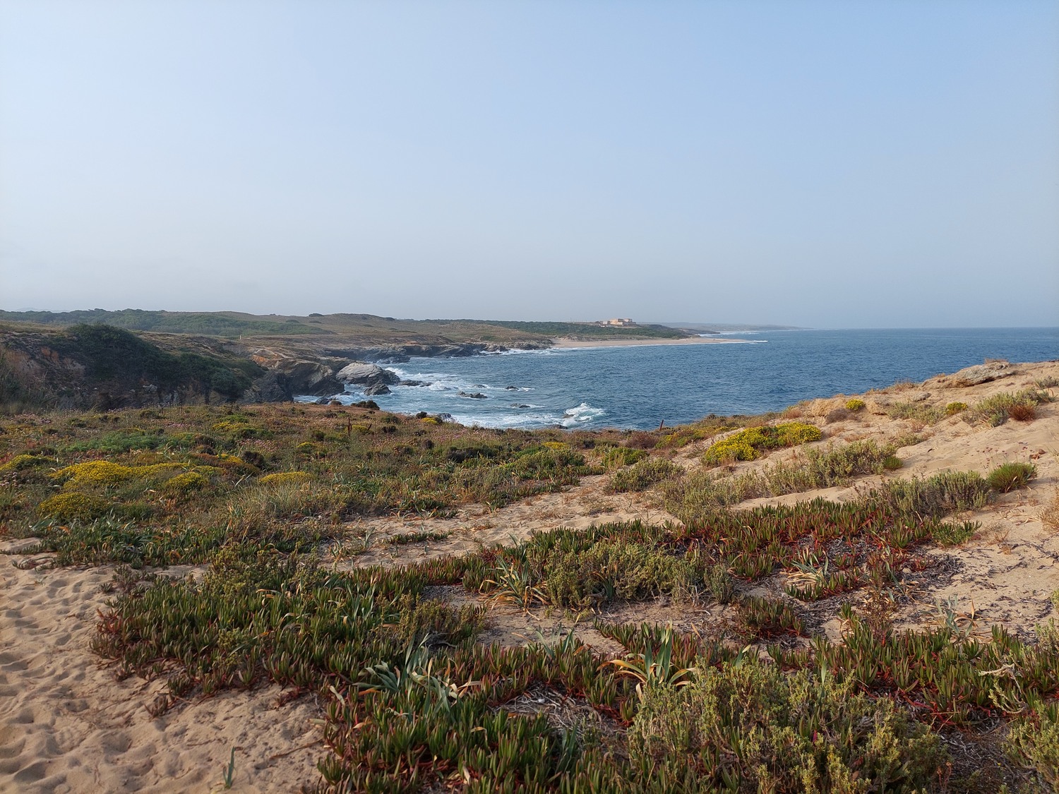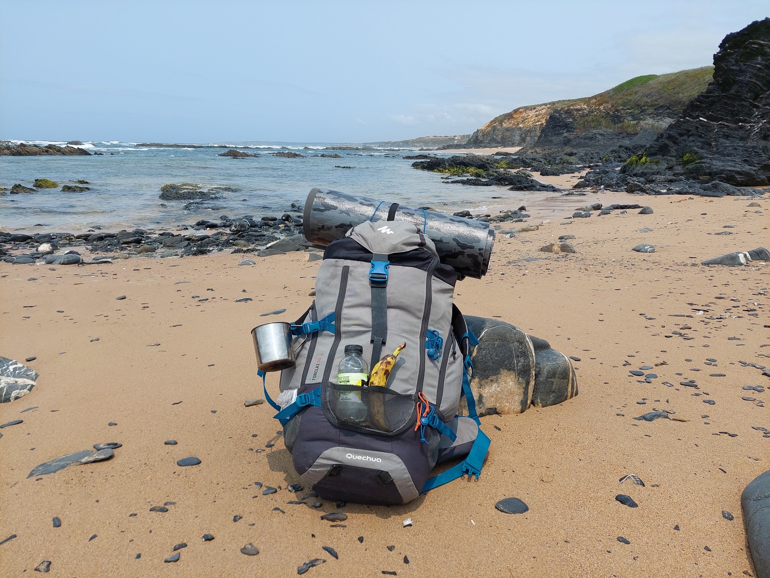 Po odebraniu plecaka ruszyliśmy z Karolem do Porto Covo – stamtąd miała zacząć się właściwa wędrówka. Było późno, więc zaczęliśmy szukać noclegu z namiotem… i trafiliśmy idealnie: ukryte miejsce na klifie, z widokiem na zachód słońca nad oceanem. To był najpiękniejszy nocleg całej wyprawy. Cisza, przestrzeń, horyzont.