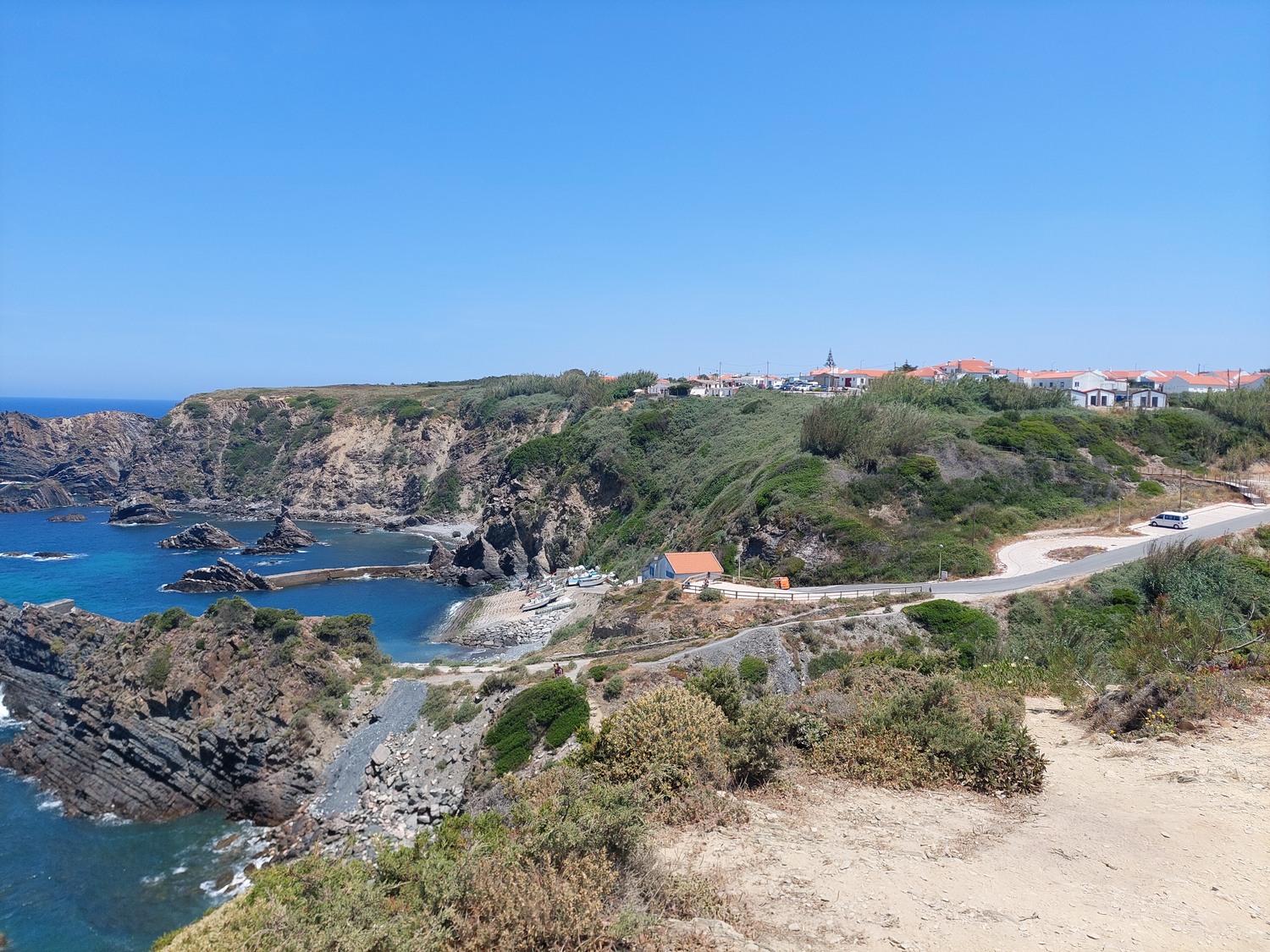 Dzisiejszej nocy był trzeci nocleg na dziko, choć brudni i spoceni wyglądalismy jak dwa nieszczęścia. Zjedliśmy na śniadanie chleb z miodem i dotarliśmy do Zambujeira do Mar. Po trzech nocach w namiocie postanowiliśmy odpocząć i zanocować w pensjonacie z prysznicem i łóżkiem (luksus!). Wieczorem wybraliśmy się jeszcze na spacer na plażę pod klifem, ale zejście okazało się zbyt strome i błotniste – nawet z pomocą trzech naturystów na dole 😉