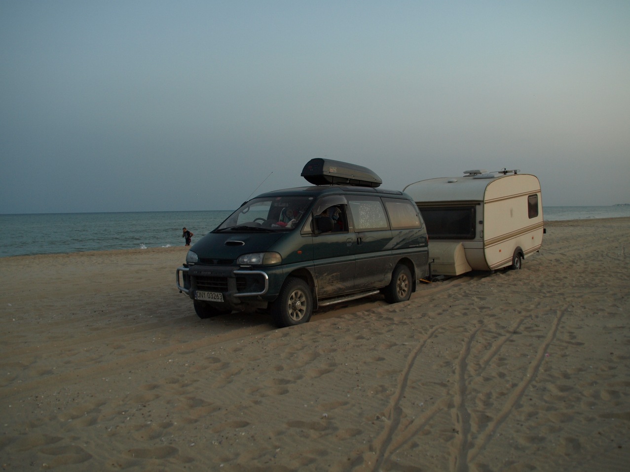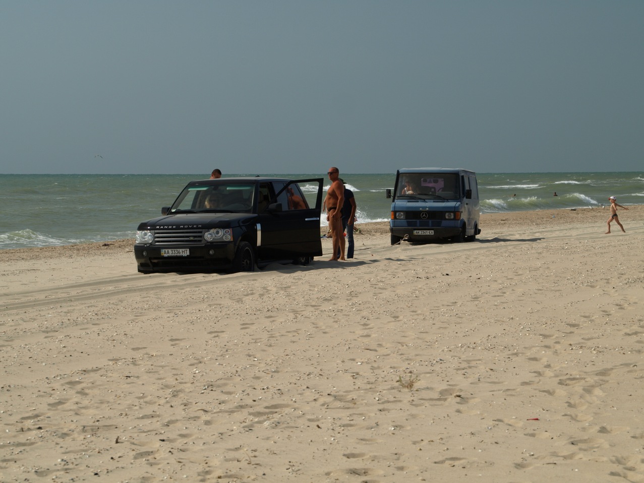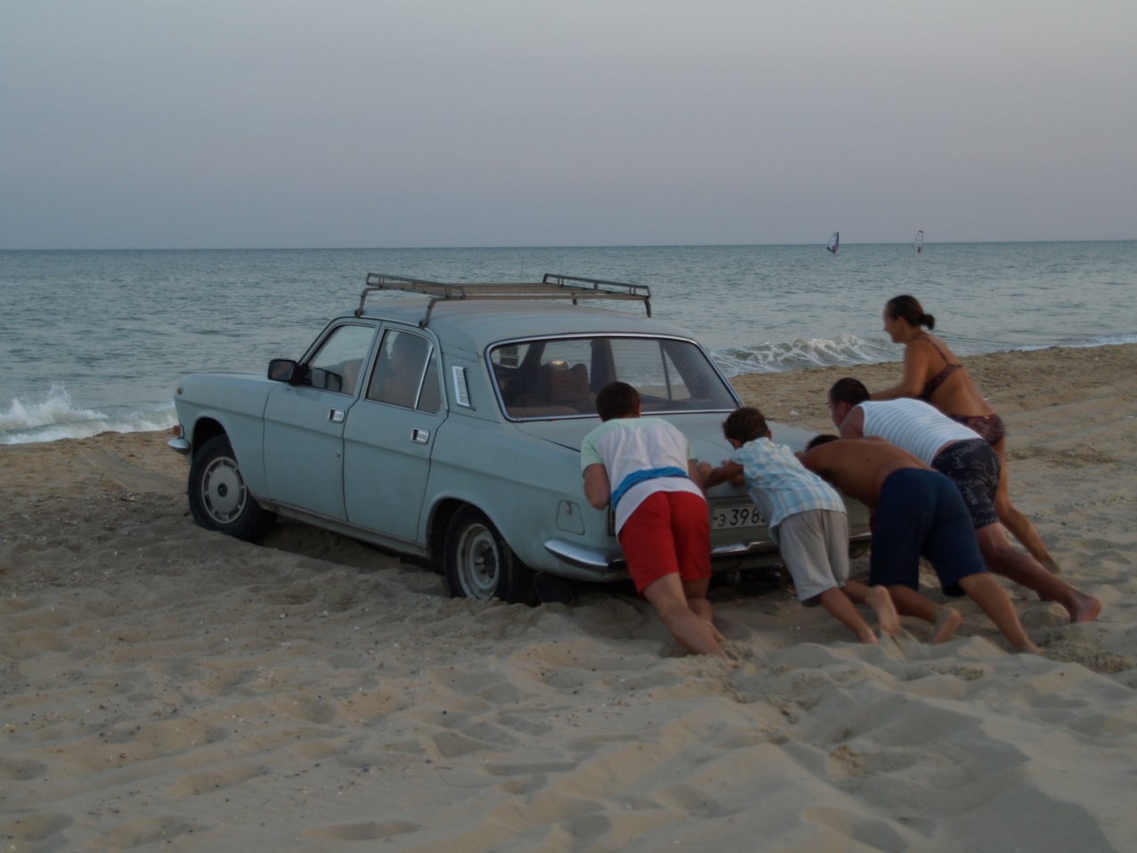 W okolicy Odessy spędziliśmy dwie noce, nocując na dziko na plaży niedaleko miejscowości Zatoka, którą wybrał Marek jako ostatni punkt na nadmorskiej drodze. Dalej nie było już nic. Miejsce było naprawdę piękne – morze, wydmy, szeroka plaża i muszle, jednak cowieczorny atak komarów uniemożliwiał spokojne siedzenie na plaży po zachodzie słońca. Trzeba było uciekać do namiotu.:( Po pierwszej nocy rano wzięłam Karola na długi spacer wzdłuż brzegu morza. A tutaj jeden golas, drugi golas, grupa golasów... Byłam lekko zdezorientowana. Pytali mnie, czy my na „dikij plaż” (czyli dosłownie tłumacząc na dziką plażę), więc odpowiadałam „tak”, a oni „To zapraszamy!”. Tylko nie wiedziałam, że dzika plaża w ich języku oznacza plażę dla nudystów! :P Takie zawiłości języka obcego, ech. :) Na szczęście dzieci niespecjalnie zwracały uwagę na nudystów, a jedni z nich , tzn. nasi „sąsiedzi”, rozbici przyczepą kempingową niedaleko nas, okazali się bardzo sympatyczni. Była to rodzina ze Lwowa, która koczowała na tej plaży już 3 tygodnie! Przyjechali starą wołgą, która nie dała rady wyciągnąć przyczepy z bardzo piaszczystej plaży. Marek przyszedł im z pomocą i mimo braku haka holowniczego jakoś udało się ich wyciągnąć na drogę naszym Mitsubishi. :)